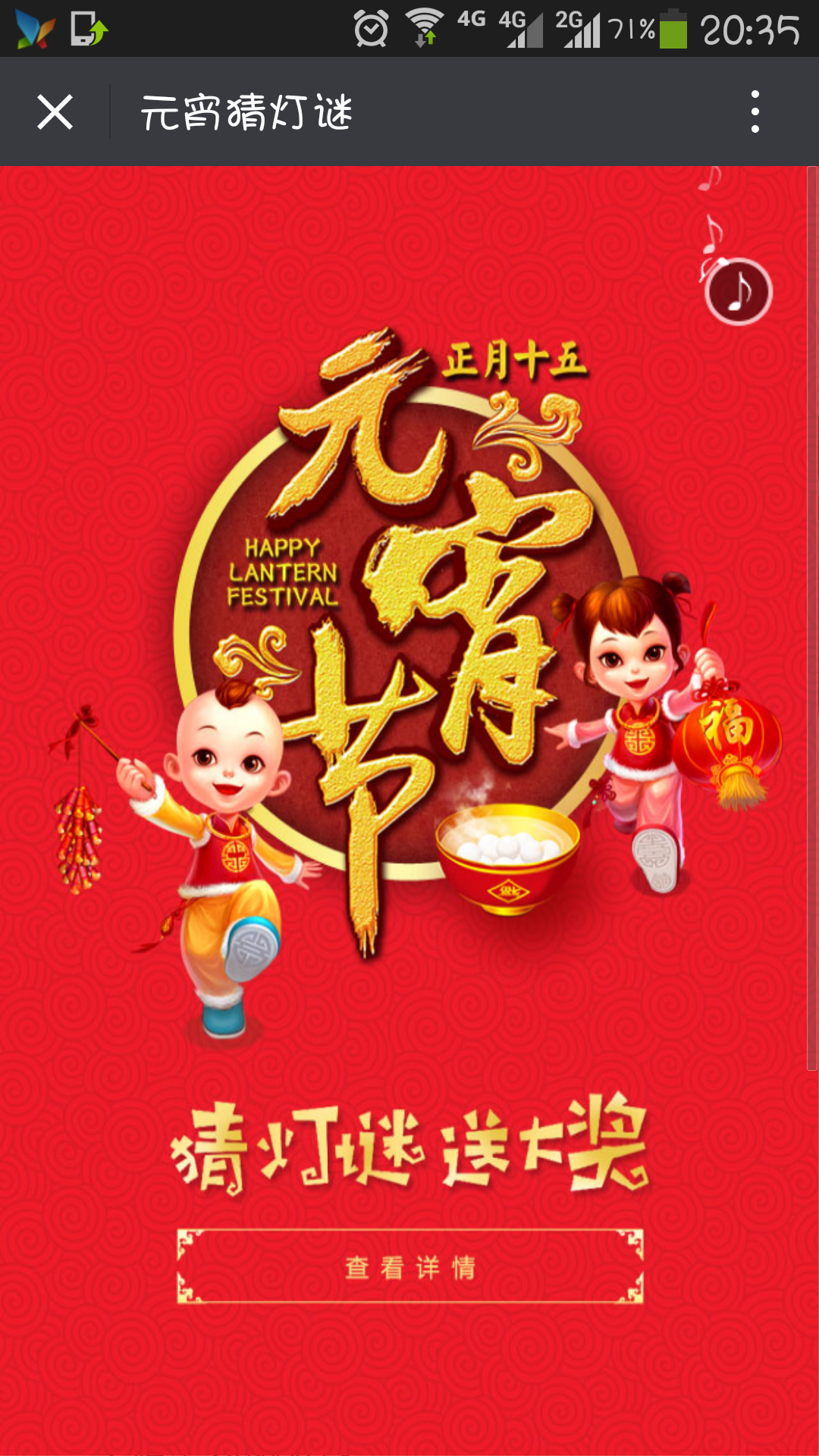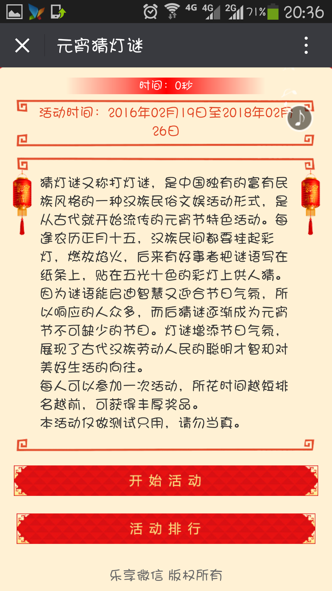 猜灯谜又称打灯谜,是中国独有的富有民族风格的一种汉族民俗文娱活动形式,是从古代就开始流传的元宵节特色活动。每逢农历正月十五,汉族民间都要挂起彩灯,燃放焰火,后来有好事者把谜语写在纸条上,贴在五光十色的彩灯上供人猜。因为谜语能启迪智慧又迎合节日气氛,所以响应的人众多,而后猜谜逐渐成为元宵节不可缺少的节目。灯谜增添节日气氛,展现了古代汉族劳动人民的聪明才智和对美好生活的向往。每人可以参加一次活动,所花时间越短排名越前,可获得丰厚奖品。
